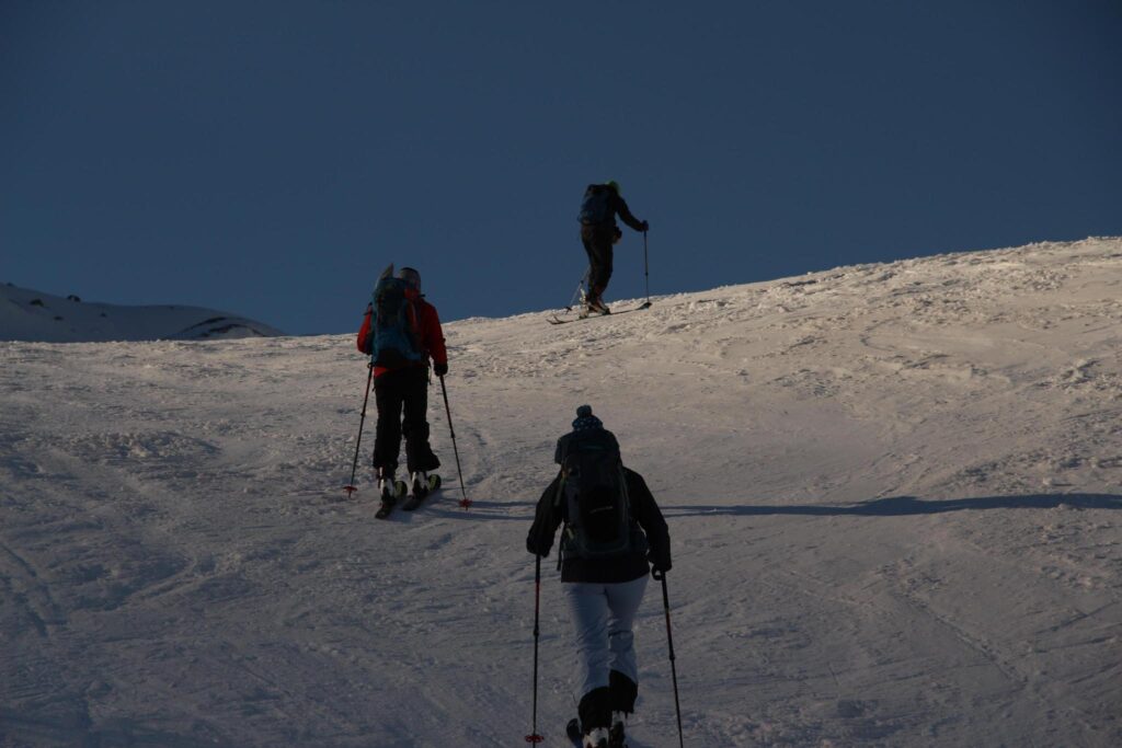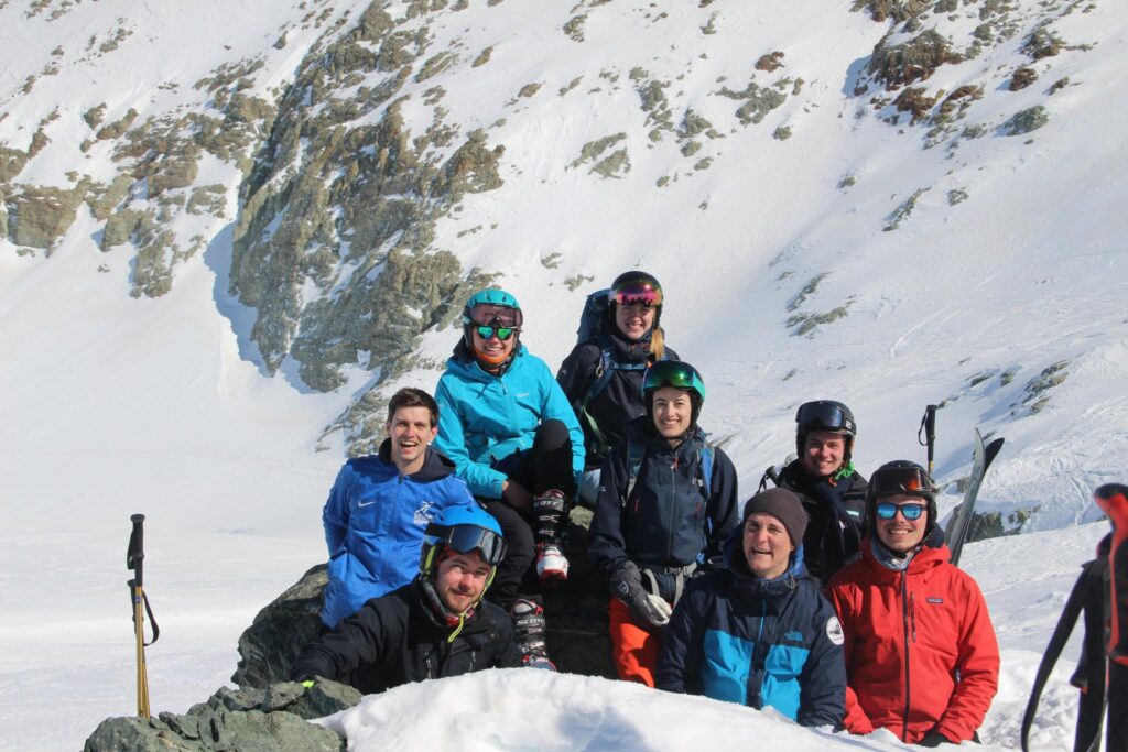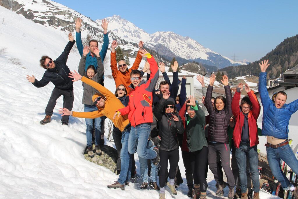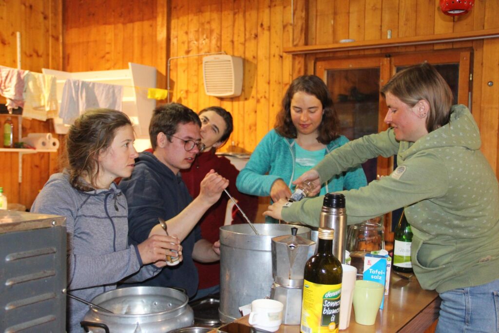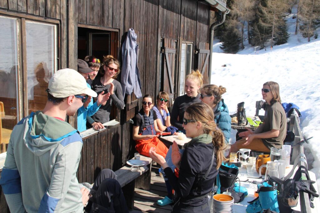 In Bivio in der Schweiz angekommen, quartierten wir uns im Haus Jua ein, einer Selbstversorgerhütte, die für die kommenden neun Tage unser Basecamp für zahlreiche Skitouren werden sollte. Jeden Abend standen nach einem reichhaltigen Essen samt Nachtisch (Stichwort Tiramisu – danke ans Essensteam!) die Tourenplanung und die Besprechung des Lawinenlageberichts für den nächsten Tag an. In Kleingruppen wurden verschiedene Touren ausgearbeitet, bei denen für jeden etwas dabei war – von der allerersten Skitour (Dank an Snic fürs Teilen seiner Erfahrung!) bis hin zu anspruchsvollen alpinen Unternehmungen.