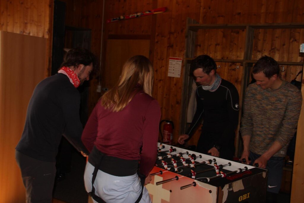 Die Abende verbrachten wir mit zahlreichen Gesprächen, Fabis Gitarrenspiel und diversen Spielen. Neben Gordischem Knoten und Psychiater war das Erklär-Pantomime-Geräusch-Spiel das Highlight, bei dem Wörter wie „Minos Parasympathikus“ für große Erheiterung sorgten. Wer frühzeitig von einer Skitour zurück war (oder sich einen Pausentag gönnte), war beim Schaufelfahren, Tischkicker- oder Schafkopfspielen, Schokitrinken, Iglubauen oder Eisbaden anzutreffen – oder einfach beim Chillen auf der Sonnenterrasse.